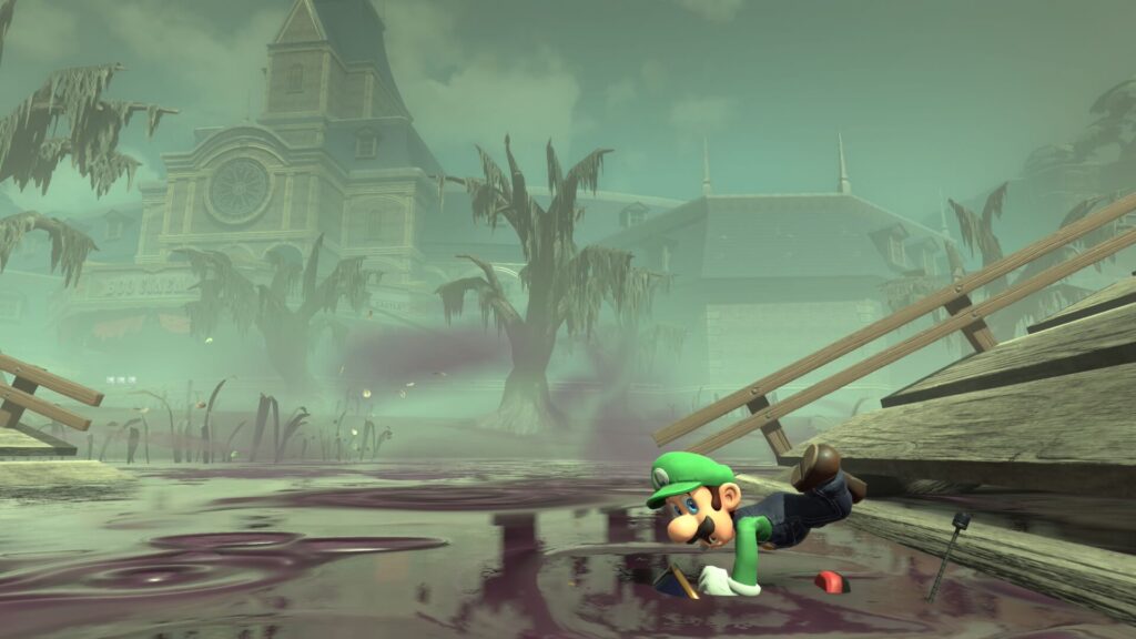 沼に落ちないよう、慎重に橋を渡っていたルイージ氏でしたが…。