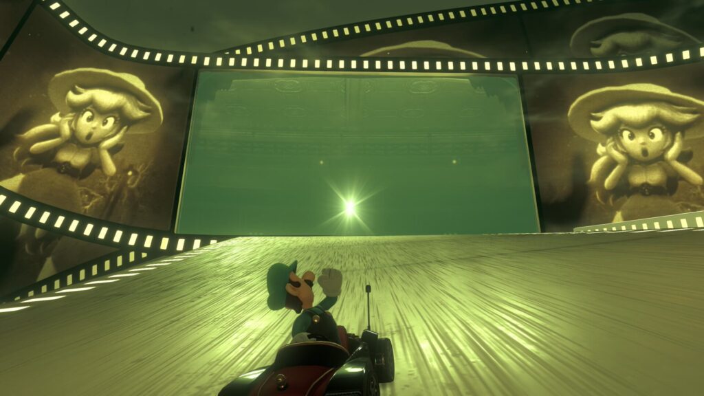 ここはネガフィルムの上を走るコースになっていて、恐怖の表情をしたピーチ姫が映っています。