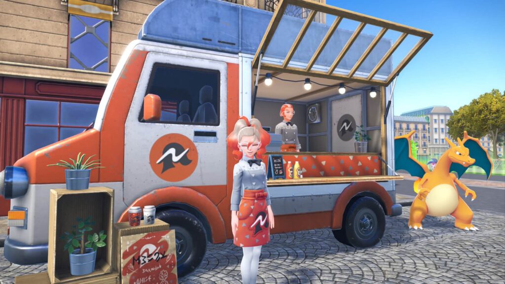 看板娘のグリーズさんと看板ポケモンのリザードンが一緒に働いていますよ。
